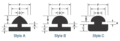 | ES P/N | STD P/N | A:Groove Width | B:Head Height | C:Bumper Height | D:Groove Dia. | E:Head Dia. | F:Bumper Dia. | Style |